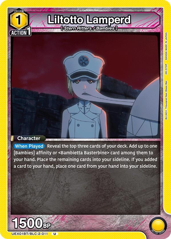 Description: [When Played] Reveal the top three cards of your deck. Add up to one [Bambies] affinity or "Bambietta Basterbine" card among them to your hand. Place the remaining cards into your sideline. If you added a card to your hand, place one card from your hand into your sideline.